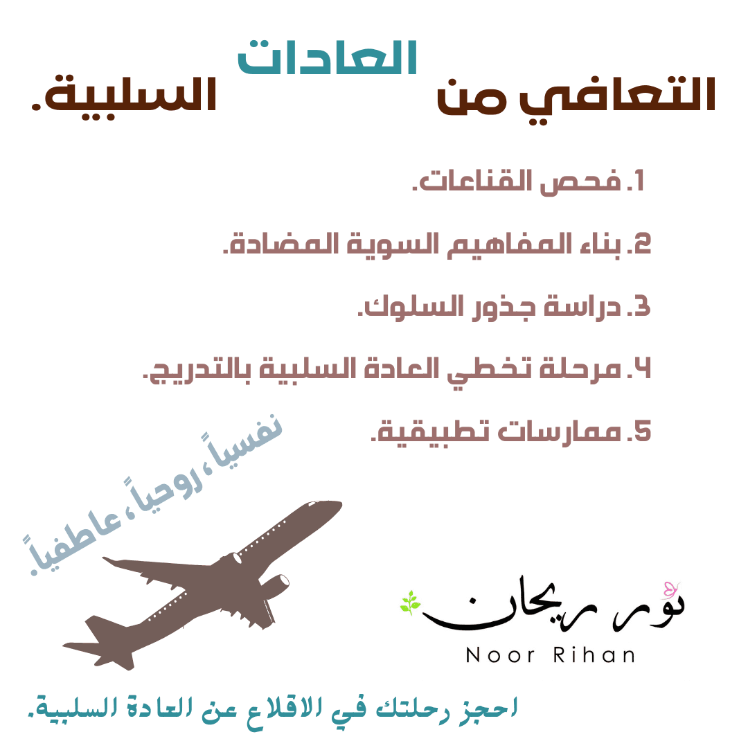 برنامج فردي يحرص على اهمية ترك العادات السلبية في حياتنا اليومية. وطرق للتعافي منها بسكل كامل مع المستشارة: نور ريحان. خبرة في مجال التعافي النفسي والاجتماعي وغيره. برنامج متكامل فردي. متابعة لمدة شهرين بقيمة: 3900
