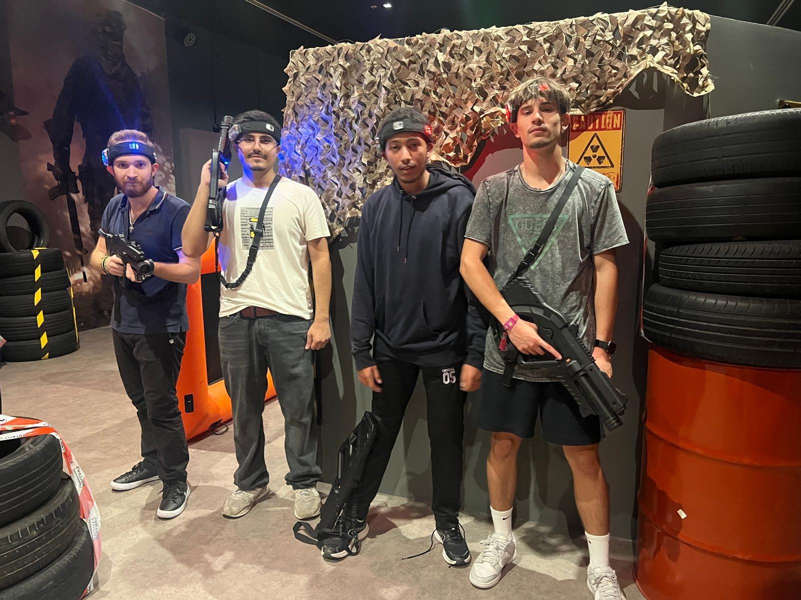استمتع بحزمة مدتها 30 دقيقة تسمى (تجنيد) لكل لاعب. تعتبر لعبة الليزر خدمة ترفيهية مثيرة ومليئة بالحركة والإثارة، حيث تجمع بين عناصر النشاط البدني والاستراتيجية والمتعة في لعبة عالية الطاقة. تتم لعب اللعبة عادةً في ساحة مصممة بمجموعة متنوعة من العوائق، وغرف مظلمة، وأضواء متوهجة لتعزيز التجربة. يتم تجهيز اللاعبين بسترات حساسة للأشعة تحت الحمراء وبنادق ليزر، والتي يستخدمونها "لتحديد" الخصوم من خلال إطلاق أشعة تحت الحمراء. عندما يتم إصابة الخصم، يقوم سترته بتسجيل الطلقة، مما يؤدي في كثير من الأحيان إلى تعطيل سلاحه مؤقتًا أو إضافة نقاط إلى مجموع نقاط مطلق النار. الهدف هو التفوق على الفريق المنافس من خلال وضع علامة على أعضاء الفريق الآخر مع تجنب أن يتم وضع علامة عليك.