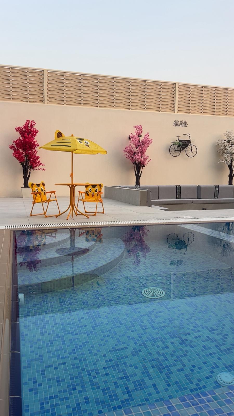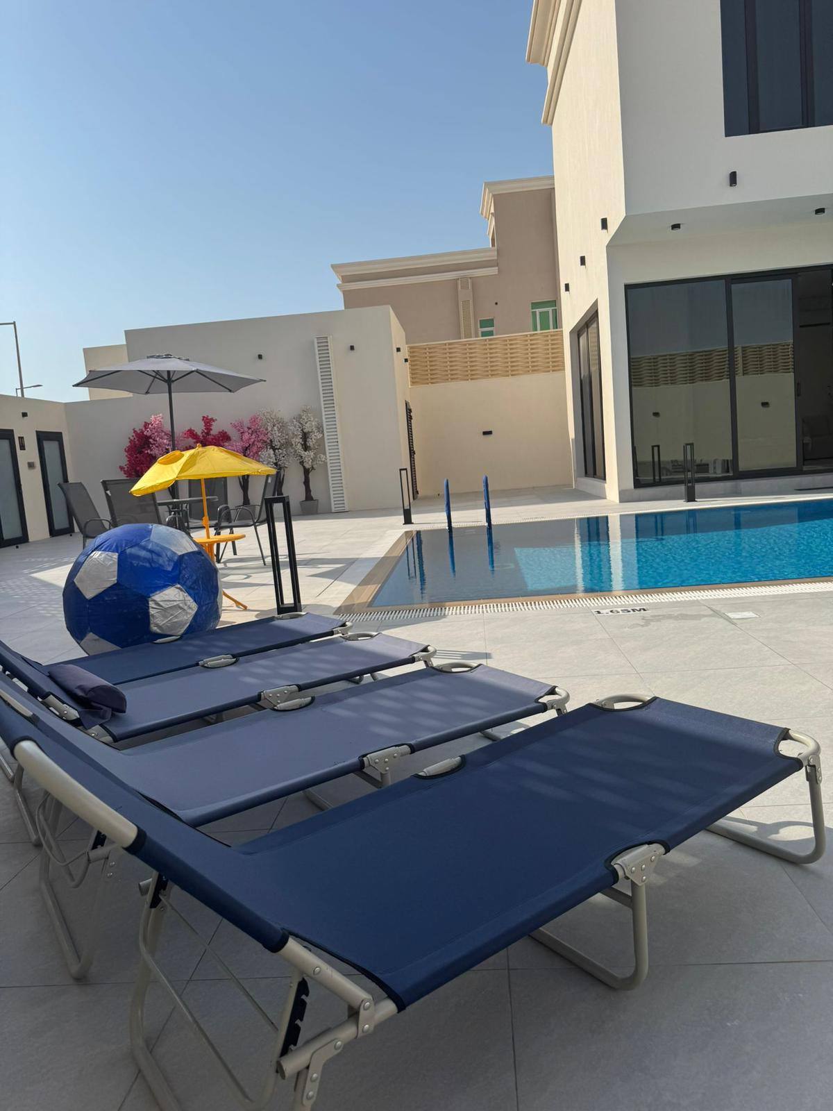 Indulge yourself and your loved ones with this luxurious, 3 master bedroom resthouse located in Al Ruwais, 2 minutes from Al Ruwais corniche. The rest house includes a refreshing outdoor swimming pool, and a sperate kids pool, all equipped with outdoor showers. For the outdoor activities the rest house offers a BBQ area with its own hand washing facility. Inside you will get 2 master bedrooms with king size beds and third master bedroom with 2 single beds. A fully equipped kitchen and a 12 person dining table inside the large living room that has a big smart TV and high s[peed Wi-Fi connection.