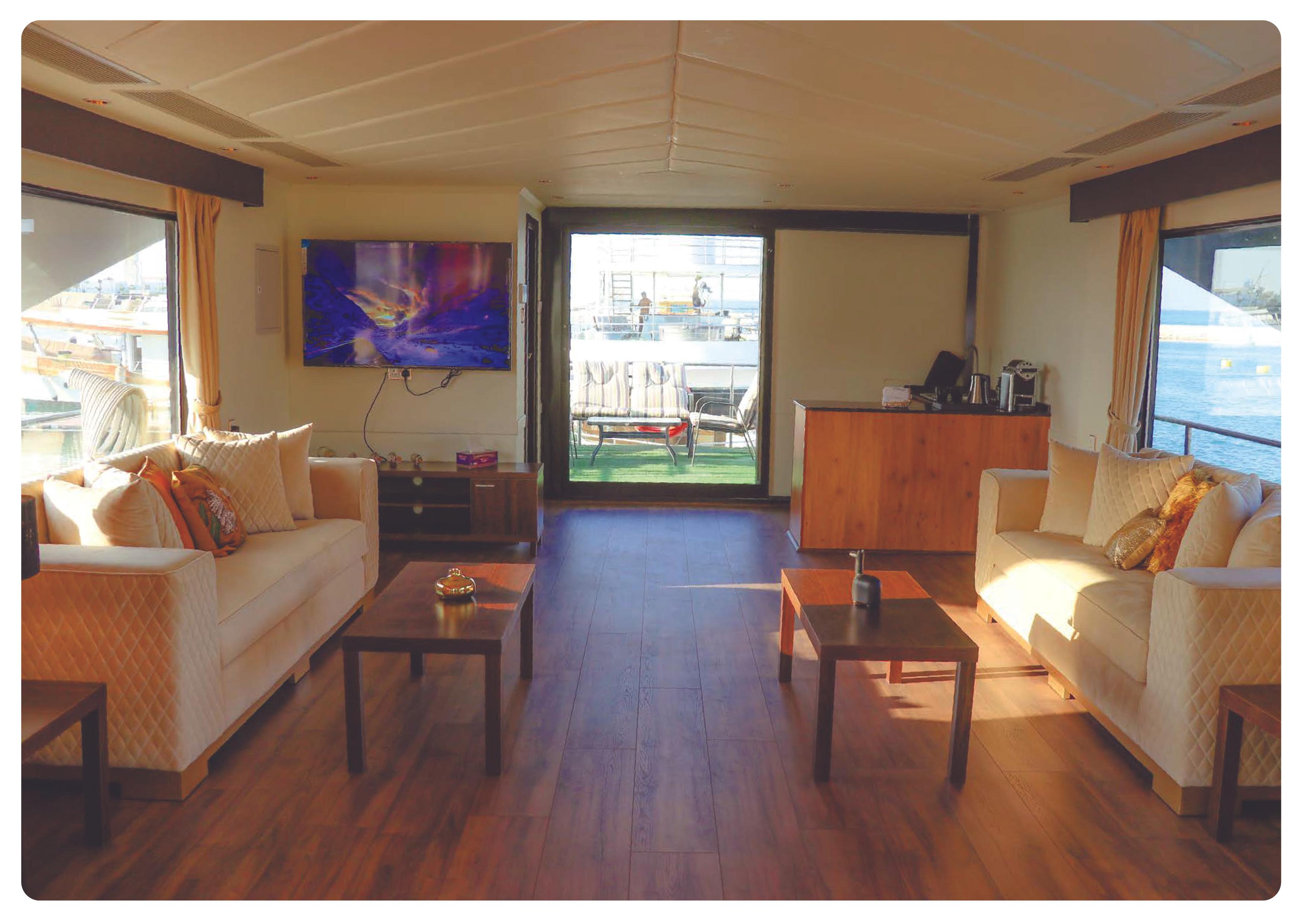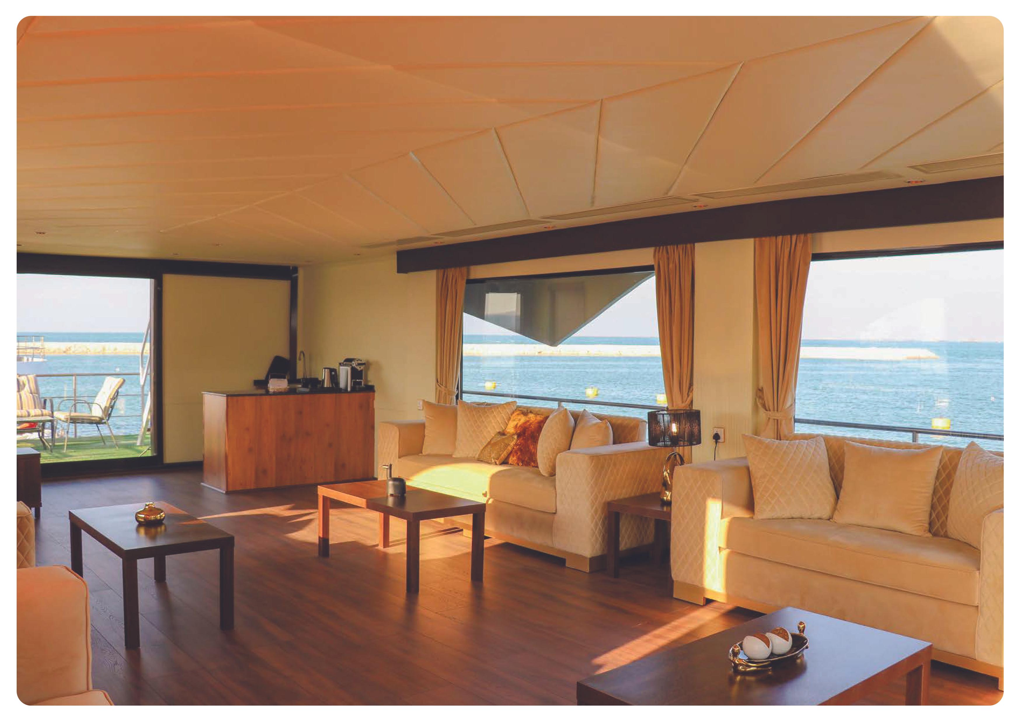 A luxury yacht located in pearl consists of 2 halls, 2 master bedrooms,2 bathrooms, 2 outside sitting area, and 1 Spacious Roof.