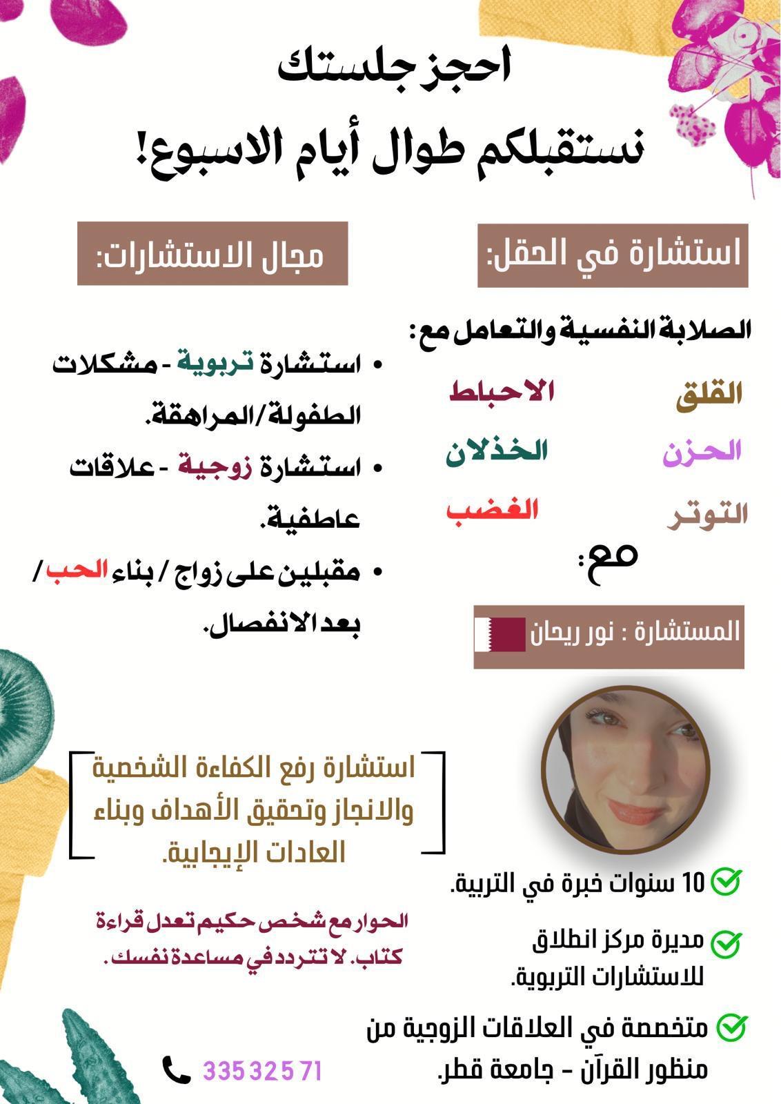 Consulting fields: Educational, marital, those about to get married. Consultation value: 980 Qatari Riyals
