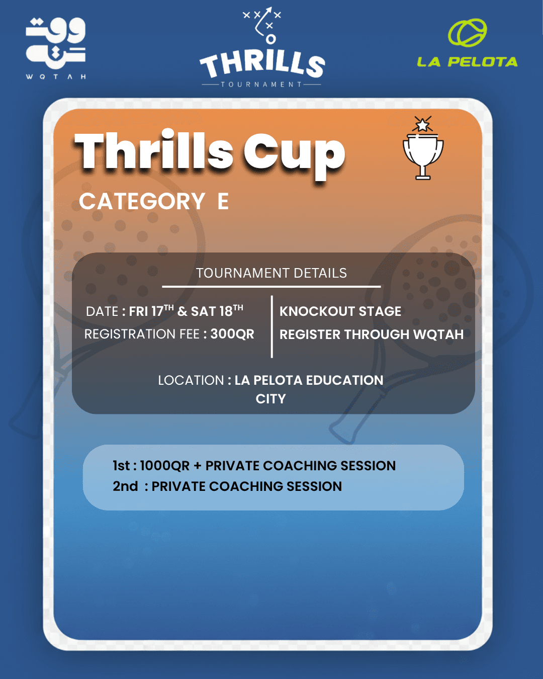 Calling all padel enthusiasts! Get ready to showcase your skills and ignite the competition at this Padel tournament. Fully equipped halls with all the players' needs provided. Highly skilled and experienced judges to ensure fair play. Max 24 team’s category E, each consisting of 2 players. Location: La Pelota - Educational City 1st place: 1000QR + Private Coaching session 2nd place: Private Coaching session
