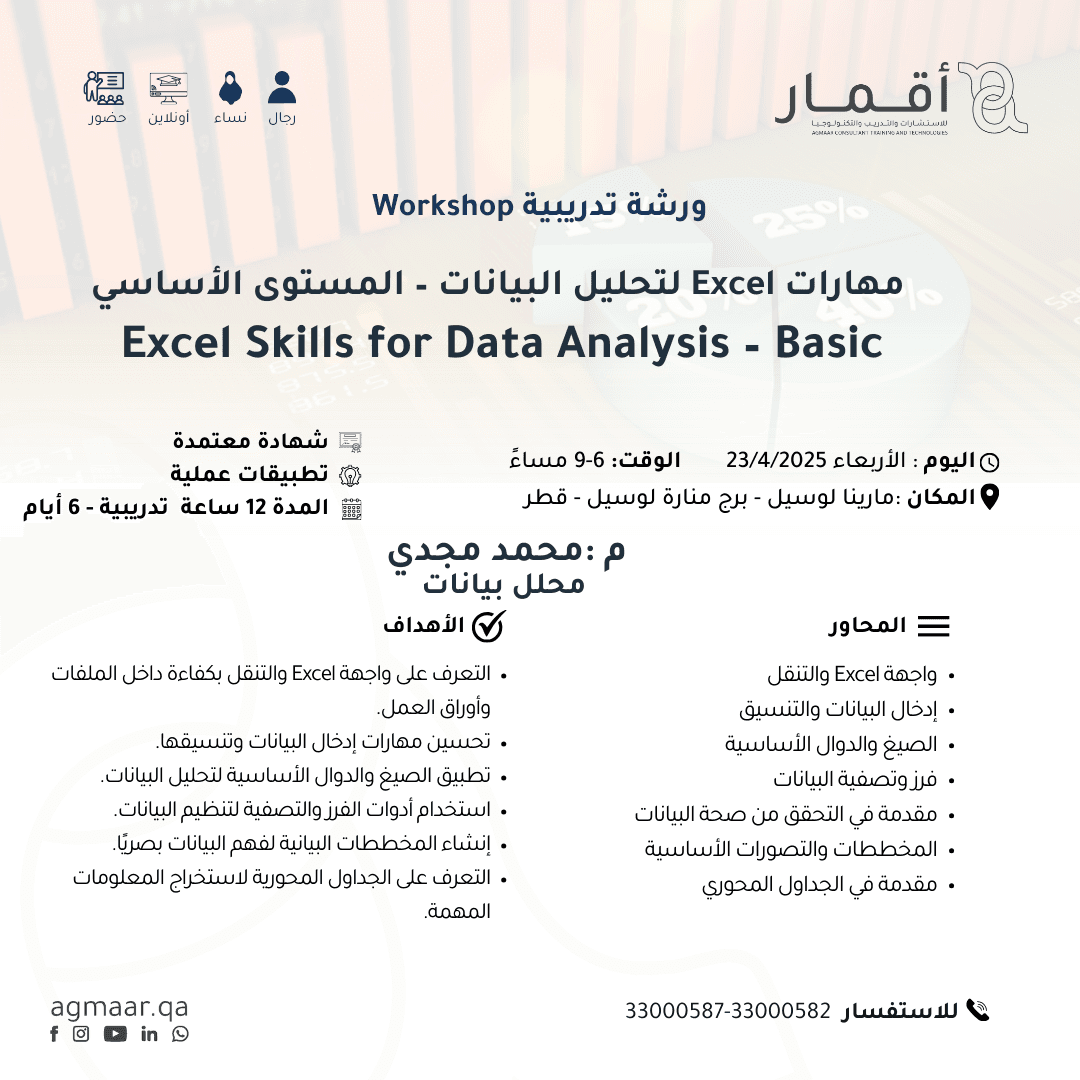 This course is designed to equip participants with the essential skills to use Microsoft Excel for data analysis. Trainees will learn how to navigate the Excel interface, enter and format data, apply basic functions and formulas, organize data using sorting and filtering, and create charts and pivot tables for better data insights. The course is ideal for beginners or anyone seeking to improve their Excel-based data analysis skills. 🗓 Start Date: Wednesday, April 23, 2025 ⏱ Duration: 6 training days – total of 12 hours (6:00 to 9:00 PM) 📍 Location: Marina Lusail – Manarat Lusail Tower – Qatar 🎓 Certified Course + Hands-on Practice